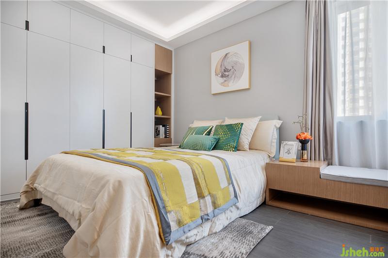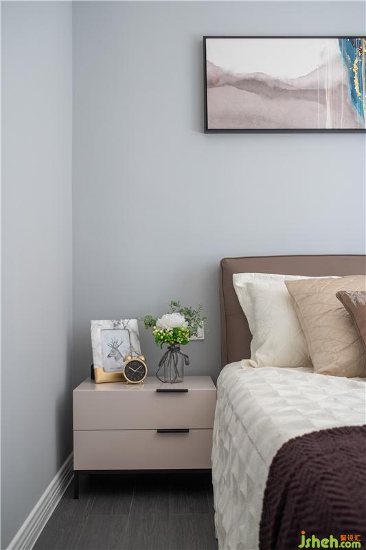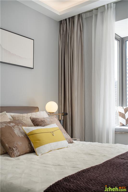 客臥的飄窗搭配雙簾,自然光線流入房間,時(shí)而開(kāi)放時(shí)而隱秘;精美床品,腳邊花毯,整體氛圍令人見(jiàn)之心生柔軟。以居者為上,還原舒適本真,便是精致之作。