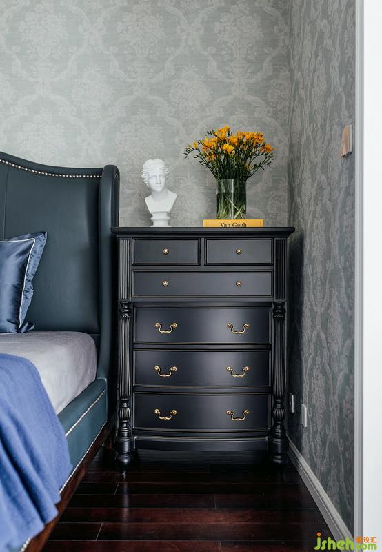 主臥延續(xù)客廳的主色調(diào), 彌漫著浪漫輕柔氣息,沒(méi)有過(guò)多的裝飾,在不同層次的藍(lán)的渲染下,打造出文雅清幽的居住氛圍。