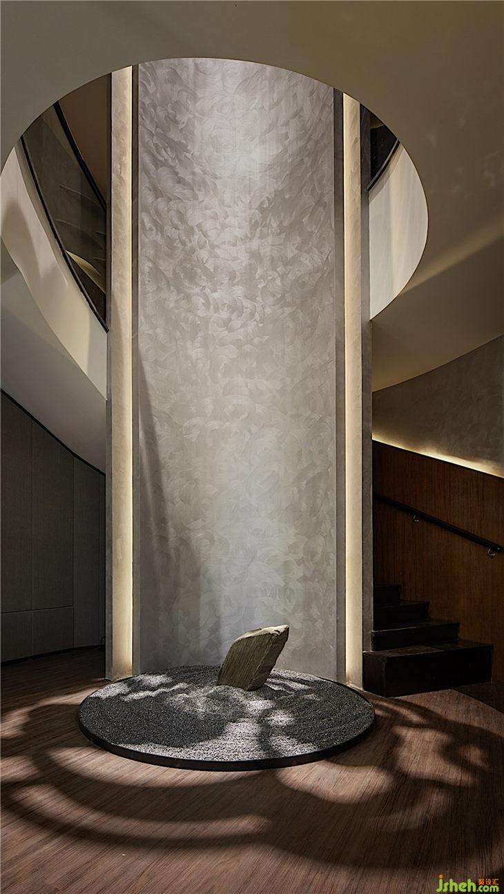 設(shè)計(jì)師著重于創(chuàng)建空間,首先在第一層先營(yíng)造空間的流線,而后賦予空間一定的文化意義和精神內(nèi)涵,簡(jiǎn)潔如斯,卻又豐富于此。主要材料華為不奢、雅而不俗的設(shè)計(jì)理念,將整個(gè)空間定義為清新典雅、古風(fēng)茶韻,汲取新中式元素,通過(guò)配飾的運(yùn)用使所有小空間風(fēng)格統(tǒng)一、區(qū)域有別,達(dá)到功能與審美的融合。格柵和飾物的倒影若隱若現(xiàn)。在設(shè)計(jì)語(yǔ)言的運(yùn)用上,設(shè)計(jì)師延伸了建筑的格柵外觀,運(yùn)用細(xì)長(zhǎng)的木格柵,而非實(shí)體的隔墻界定出各個(gè)功能“盒子”。走向扶梯延伸到第二層,高掛在側(cè)的一組層疊相間組成的“云燈”極為別致,設(shè)計(jì)師巧妙的運(yùn)用空間元素,在“云燈”錯(cuò)落有致的燈光映射下讓整個(gè)空間飽滿而立體。