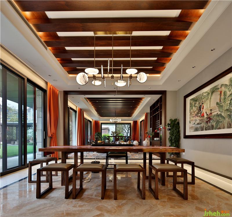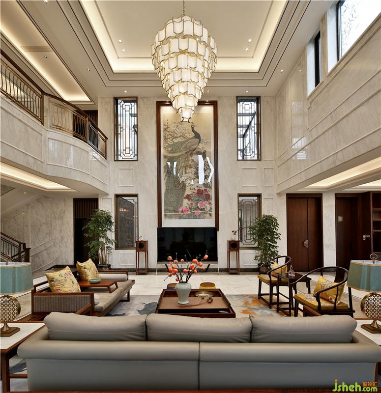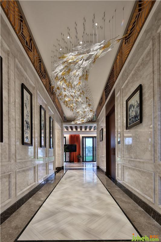 室內硬裝方面運用大面積的大理石鋪設以及軟裝方面中式家具的選擇、國畫的點綴,在空間中顯出別有風致的