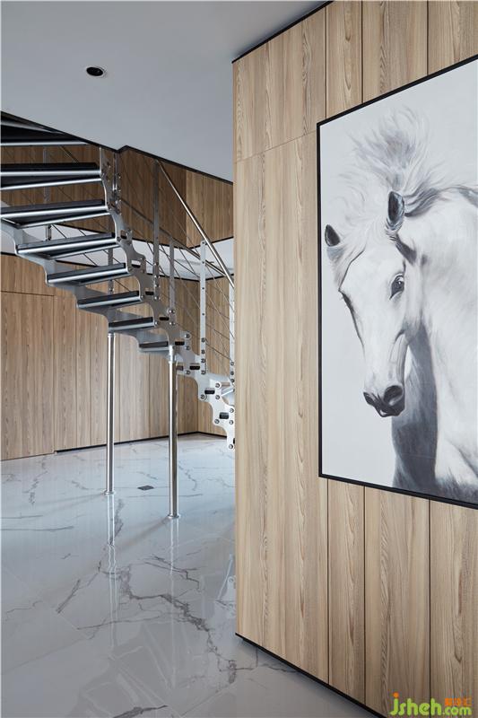 主材名稱:雪花白大板瓷磚,淺灰色護(hù)墻板,夾絲藝術(shù)玻璃,灰色木地板,黑色金屬收口件等。