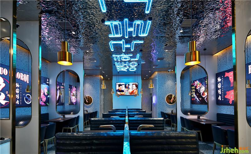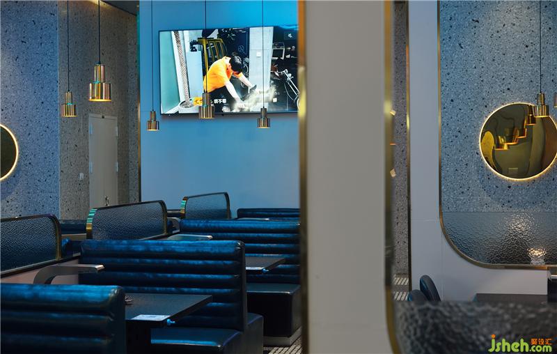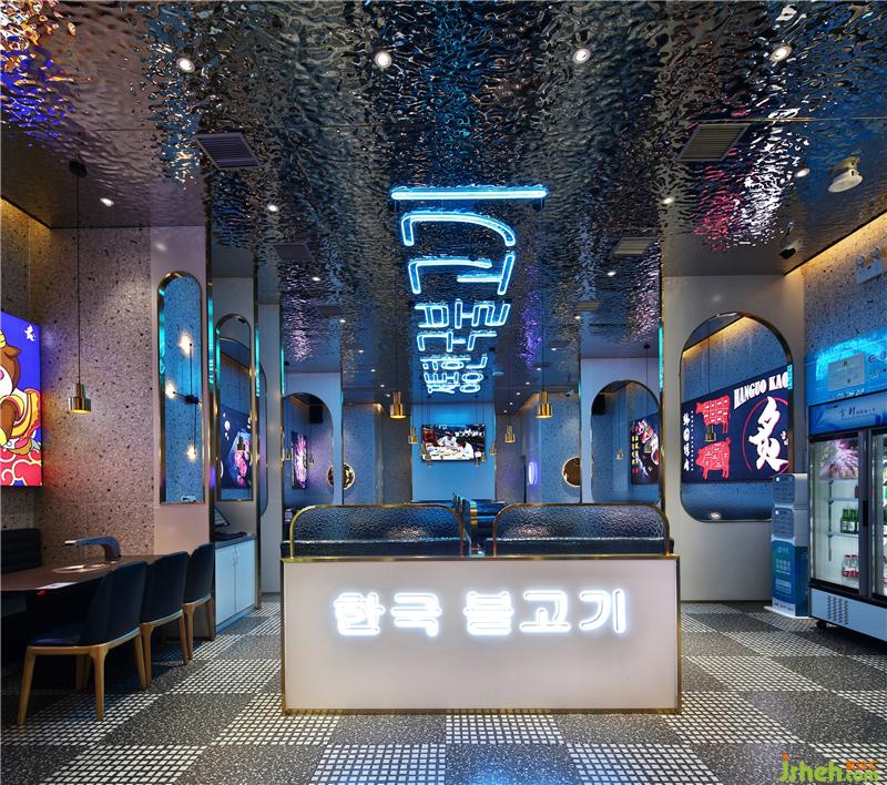 進(jìn)入大廳左右兩側(cè)的卡座區(qū),環(huán)繞著醉人的燈光,柔軟的淡藍(lán)色,加之一抹興奮的橘黃,以及波光粼粼的天花,給人一種海洋中的感覺(jué),而在這時(shí),桌面上滋滋作響的烤肉,以及香味又把人們拉回到現(xiàn)實(shí)當(dāng)中,開始這趟美食之旅。
