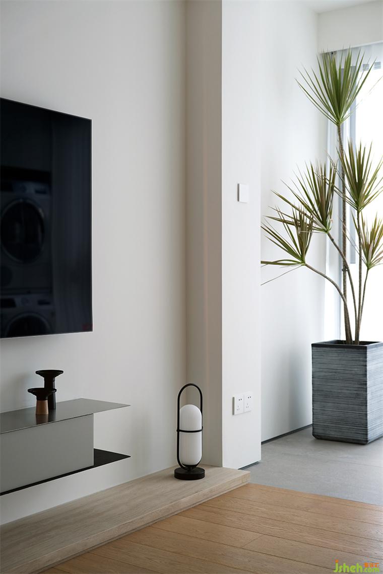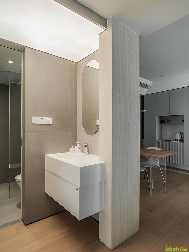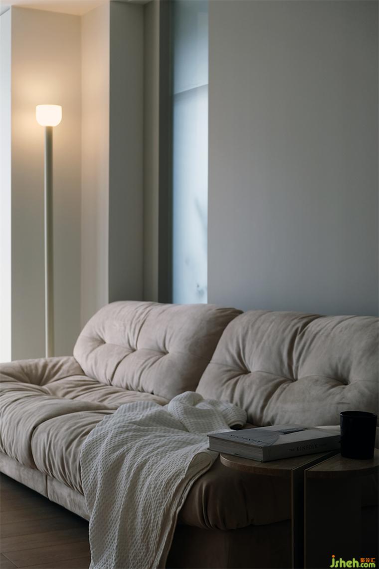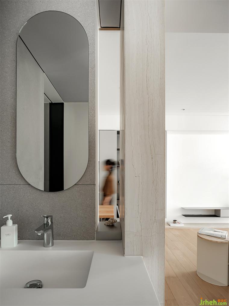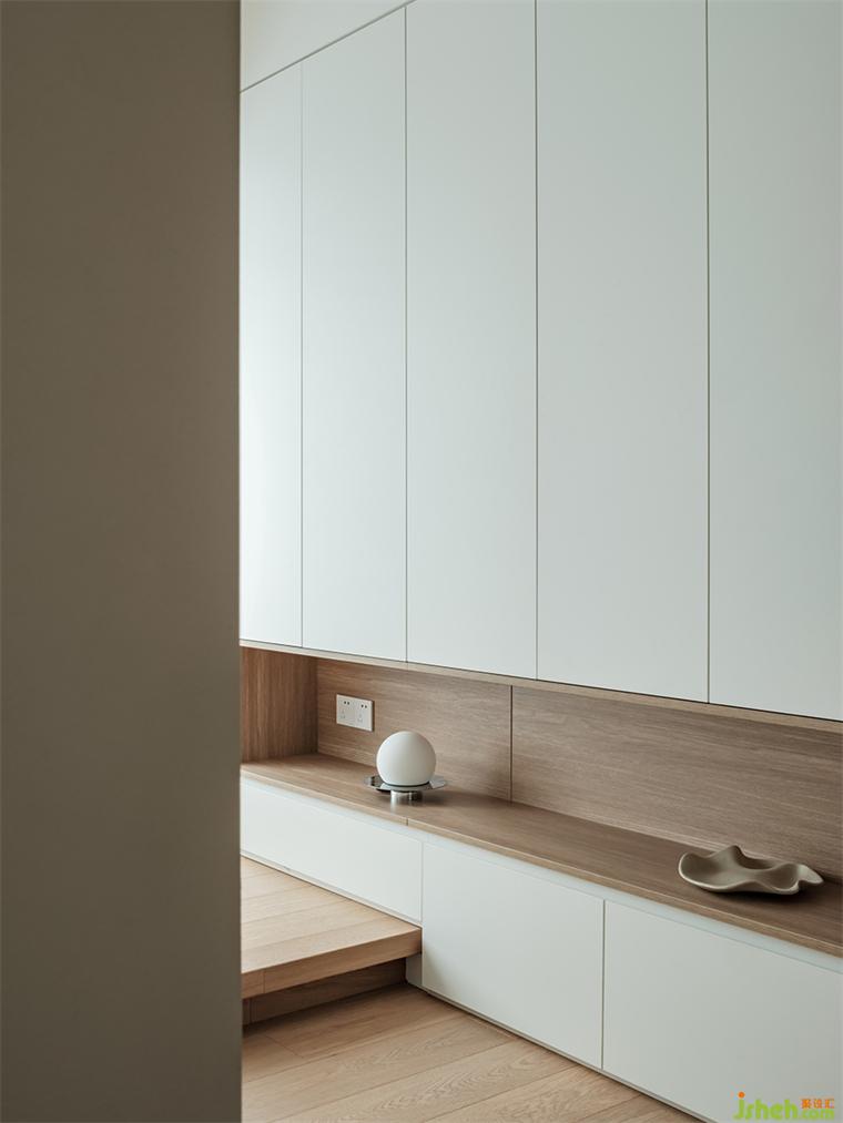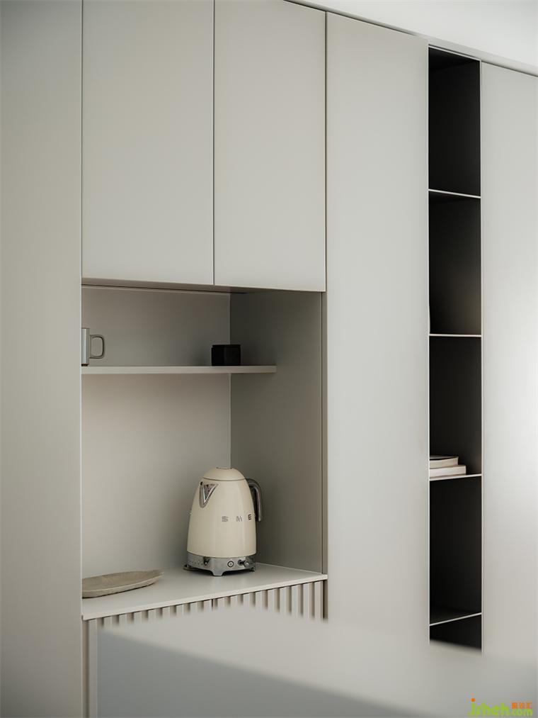 89㎡的空間中,我們?cè)O(shè)置了連排柜體,實(shí)現(xiàn)功能豐富的收納系統(tǒng)。但另一方面,大體量柜體必然帶來視覺上的壓迫感。我們利用開放格形成柜體的分區(qū),類似大自然中河川形成的自然分隔,裝修設(shè)計(jì)并暗示其功能上的區(qū)分。柜體消除了任何多余的線條,帶來利落的極簡(jiǎn)主義美感。