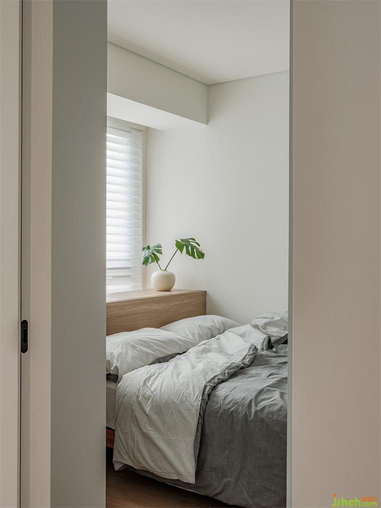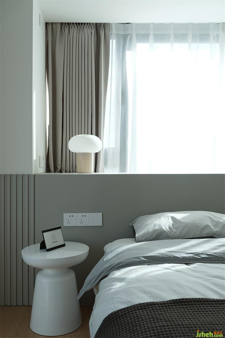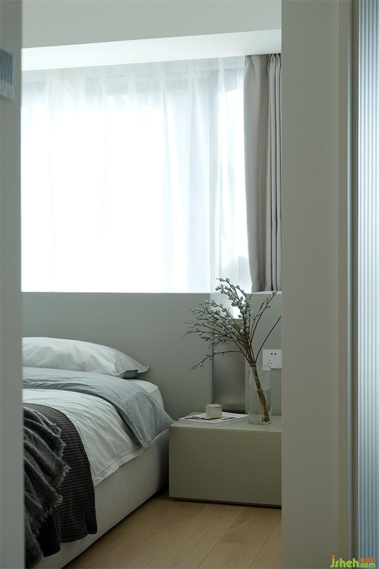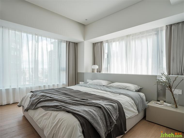 主臥延續(xù)奶茶色基調(diào),兩面臨窗,暖陽灑入,我們以同樣高度的淺灰色飾面,裝修設(shè)計整合東面臨窗區(qū)域為床頭區(qū),并安排儲物柜體,對面墻體則設(shè)置整面衣柜,高度統(tǒng)合的空間簡約而潔凈。