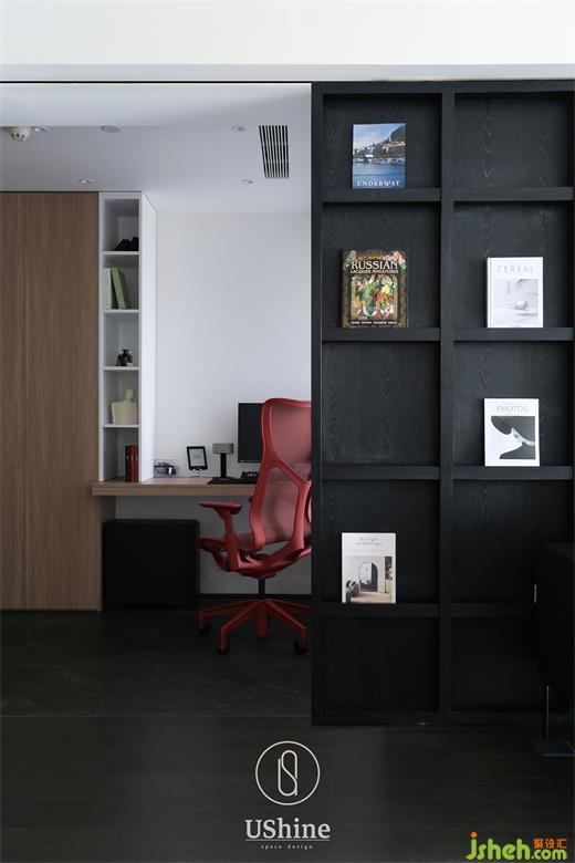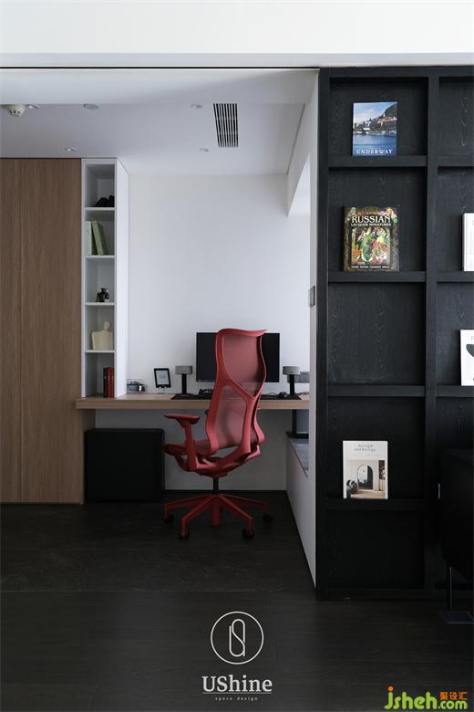 男主人希望有一個開放式的工作室,并能在需要時閉合。深圳海納公館家裝設計我們打掉最小臥室的非承重墻部分,將光線引入玄關,利用承重墻體做自然分隔,沿另一面墻依次設置封閉柜體、開放書架和書桌,延伸至飄窗,舒適而明亮。