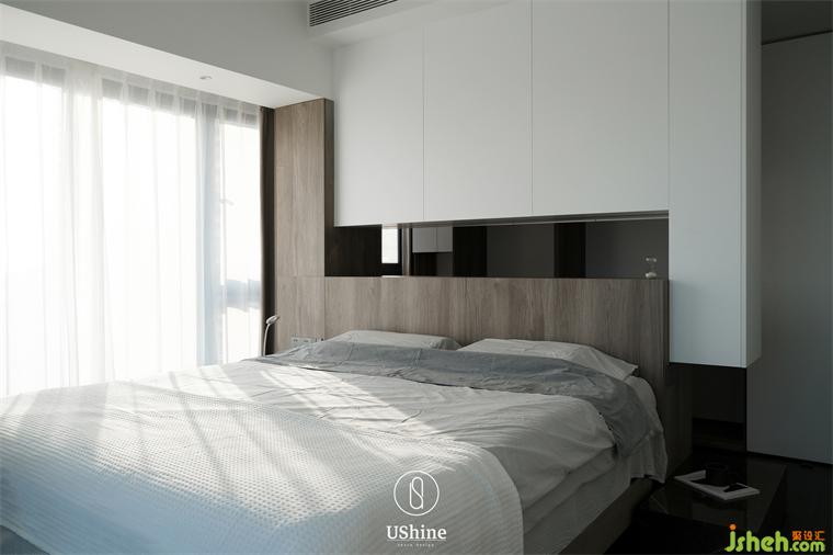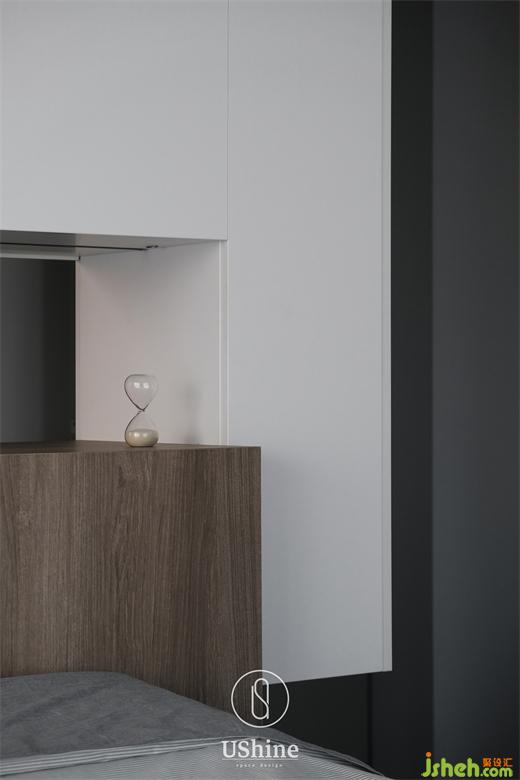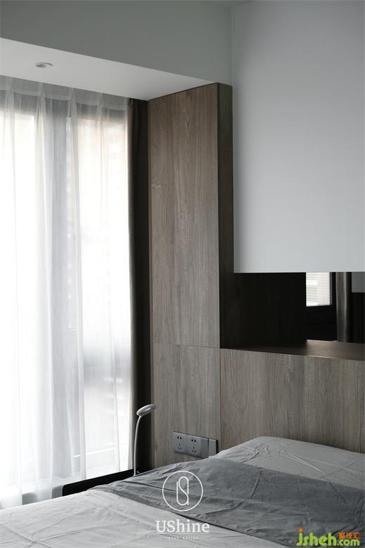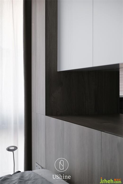 衣帽間延續(xù)同樣的色彩搭配,木色為開(kāi)放式掛衣置物區(qū),白色抽屜收納細(xì)小物件。一塊層板連接兩邊柜體,貼心地充當(dāng)梳妝臺(tái),以細(xì)節(jié)詮釋行隨機(jī)能。