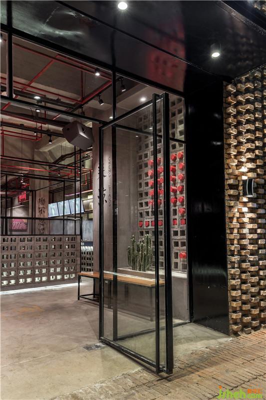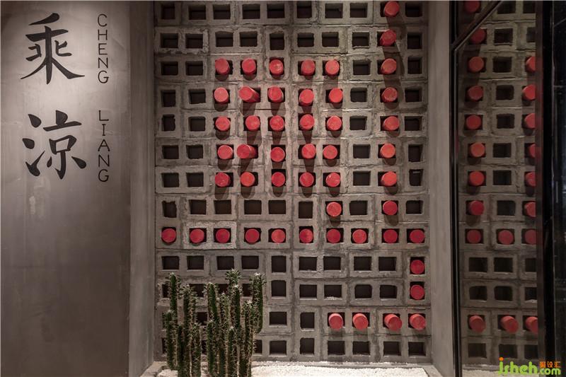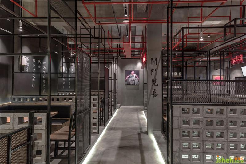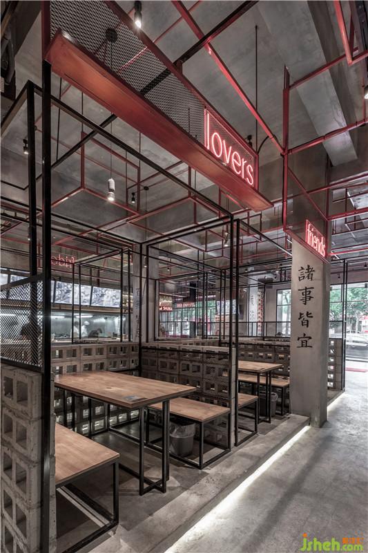 在設(shè)計(jì)過程中「工墨設(shè)計(jì)」團(tuán)隊(duì)也是本著「不堆砌」、「不浪費(fèi)」、「更多原創(chuàng)」的初心去營造這個(gè)餐廳。我們嘗試了一些原創(chuàng)設(shè)計(jì),與施工方一同研究并DIY了一些材料工藝,例如:為了制作符合現(xiàn)場(chǎng)尺寸的隔斷和吧臺(tái)材料,我們與施工方現(xiàn)場(chǎng)開模自制了一批特別尺寸和形狀的水泥空心磚;為了營造一種粗糙和精致共存的藝術(shù)裝置,我們與施工方一起研究鐵藝結(jié)構(gòu)和施工工藝,在兼顧設(shè)計(jì)美感和造價(jià)的條件下,制作出了天花和地面上紅黑對(duì)比分明,且時(shí)尚充滿視覺沖擊力的鐵藝和PVC管裝置,以及用20mm厚的特質(zhì)鐵藝方管制作而成的卡座及餐桌,等等?!感M吃飯集團(tuán)」的工程總預(yù)算控制也是設(shè)計(jì)中的亮點(diǎn),因?yàn)椴捎昧艘恍┝畠r(jià)和質(zhì)樸的材料工藝,最終總面積400㎡+的餐廳,硬裝和軟裝的總費(fèi)用控制在40萬左右,造價(jià)遠(yuǎn)低于同類型的餐飲空間。但材料的廉價(jià)并不意味著粗制濫造,恰恰相反,因?yàn)樵O(shè)計(jì)和造型的獨(dú)特性,使得空間最終呈現(xiàn)的效果獨(dú)具匠心。在設(shè)計(jì)中我們打破了圖案形狀作為導(dǎo)視和情緒傳遞的手法限制。在空間的墻面和立柱上,我們采用了例如:「乘涼」「樂不思蜀」「中國創(chuàng)造」「開門見喜」等宋體漢字。用當(dāng)代的設(shè)計(jì)語言,結(jié)合自然純樸的工藝手法。并融入中文漢字的形式加入趣味性的流行文化語言,粗中有細(xì)、即樸素又現(xiàn)代,在強(qiáng)烈的沖擊中,讓空間的氛圍變得特別。