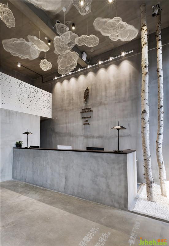 我們通過(guò)材料和造型的運(yùn)用,在空間中營(yíng)造出了天空、海洋、森林、湖泊等場(chǎng)景。酒店前廳放置的白樺樹(shù)和網(wǎng)狀云朵吊飾描繪了一個(gè)森林仙境;油蠟皮包裹的前臺(tái)以及七彩毛線裝飾的窗口,在極簡(jiǎn)的空間里起到提升空間品質(zhì)的作用;通往客房的通道鋪設(shè)了漸變色彩的地毯猶如沙灘海洋;天花和墻面布置了鋁板雕刻led燈宛若浩瀚星空和宇宙塵埃。在每一間客房?jī)?nèi)我們都放置了一顆橡樹(shù),讓自然的力量在空間里散發(fā)生長(zhǎng)。
