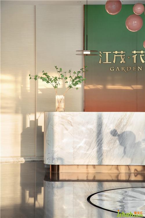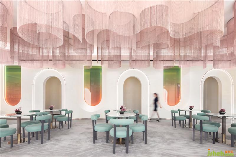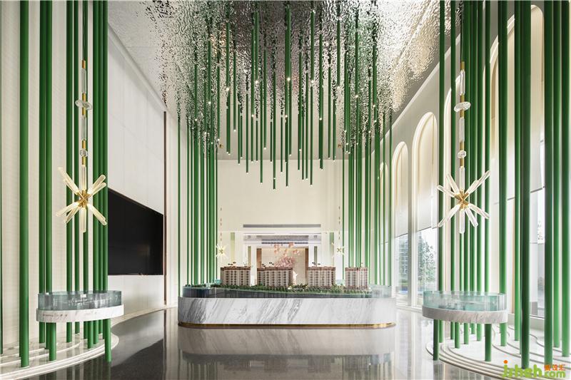 主要材質(zhì):多彩長虹玻璃、不銹鋼、爵士白大理石、漸變金屬鏈條裝置、水磨石