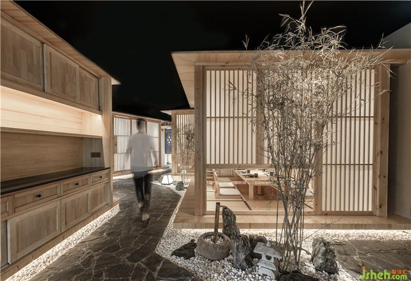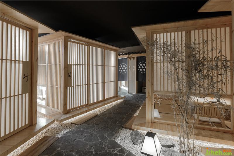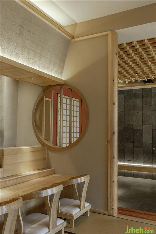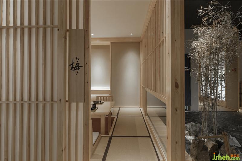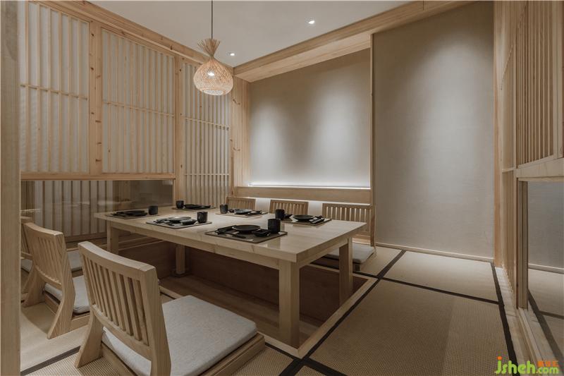 在二樓,留出了一大半?yún)^(qū)域,以包廂形式來提升消費檔次和就餐的隱秘性。包廂采用傳統(tǒng)的日式和室結(jié)構(gòu),全由木結(jié)構(gòu)構(gòu)筑而成。