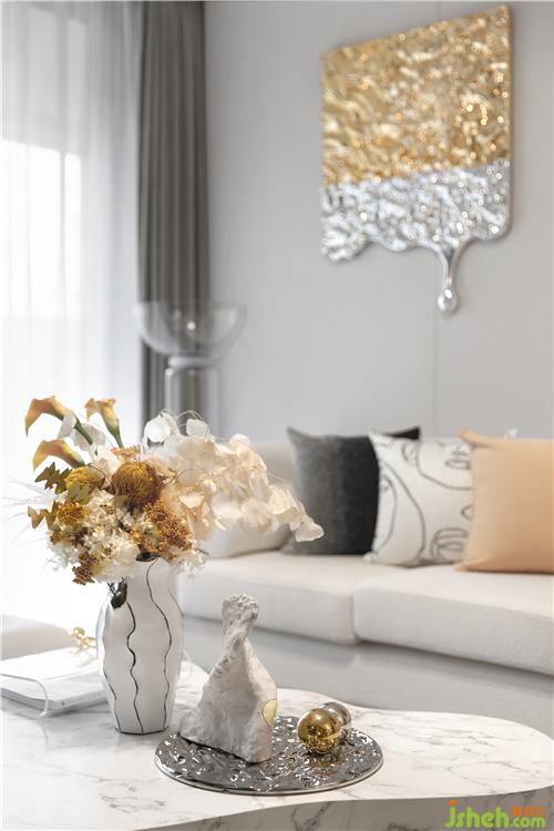 黃色穿插在米白色空間中,喚醒人們對于生活的熱情與期許。單椅與沙發(fā)形態(tài)各異,富有張力,株洲樣板房設計波點和線條點綴其間,將藝術(shù)美散發(fā)至空間每一處,詮釋生活個性化的無限想象。