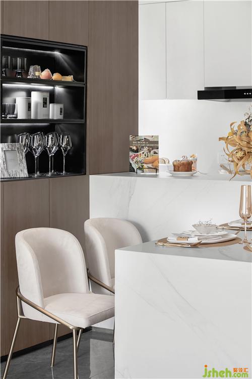 餐廳的設計以灰色調(diào)簡約的家具造型來突出,家具的線條也是簡約為主 ,燈具采用金屬材質(zhì)來體現(xiàn)出質(zhì)感,餐椅為小巧為主,使得空間更為空曠。