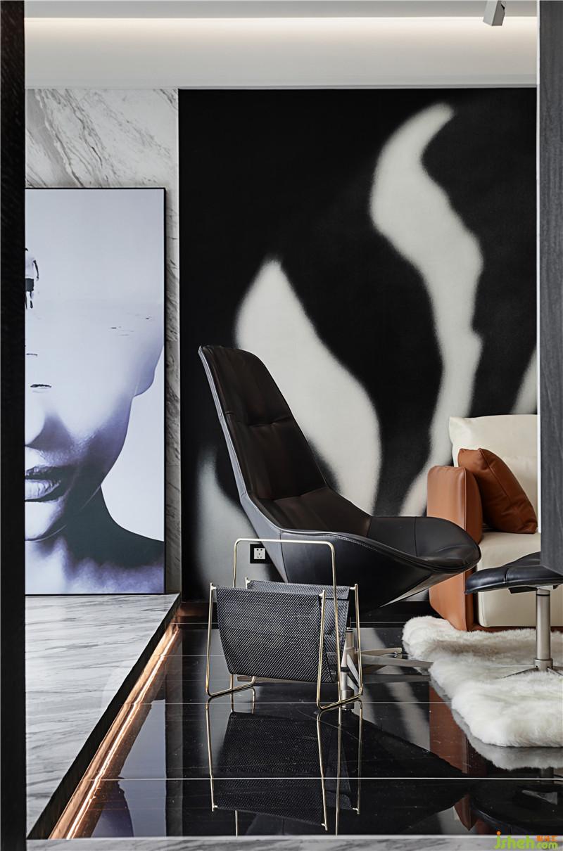 這個(gè)角度能夠比較完整地看出黑色與白色的配比以及地臺(tái)層次的呼應(yīng)銜接關(guān)系。地臺(tái)的燈光也為整個(gè)空間增添了氛圍。