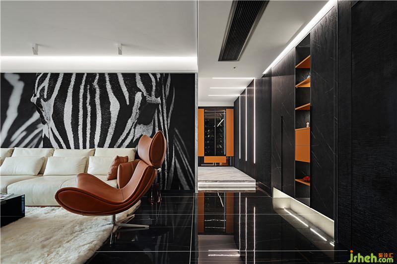 客廳裝飾柜我喜歡用懸空加燈光的設(shè)計(jì),還是為了空間的視覺變大。中間橙色的裝飾柜點(diǎn)亮了這一面墻,色調(diào)上也和餐廳空間進(jìn)行了銜接。