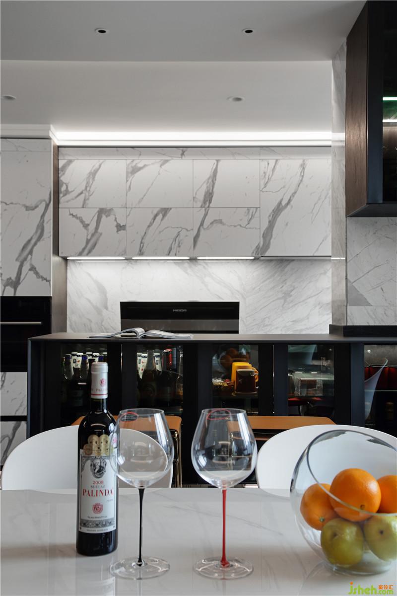 地面選用了900x1800cm的黑色大板,映襯白色的Boconcept餐桌椅和白色大理石墻面。黑與白的藝術(shù)從來不會(huì)落伍。