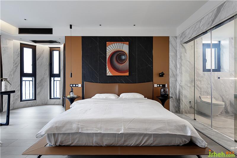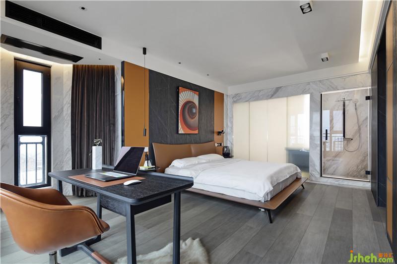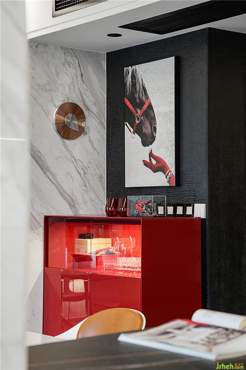 “馬”的元素不止一次地出現(xiàn),因?yàn)轳R給我積極向上的態(tài)度,激勵(lì)著我不畏艱險(xiǎn),奮勇向前。墻面上的橙色柜門板也起到了裝飾點(diǎn)綴和呼應(yīng)床背景中心的作用。