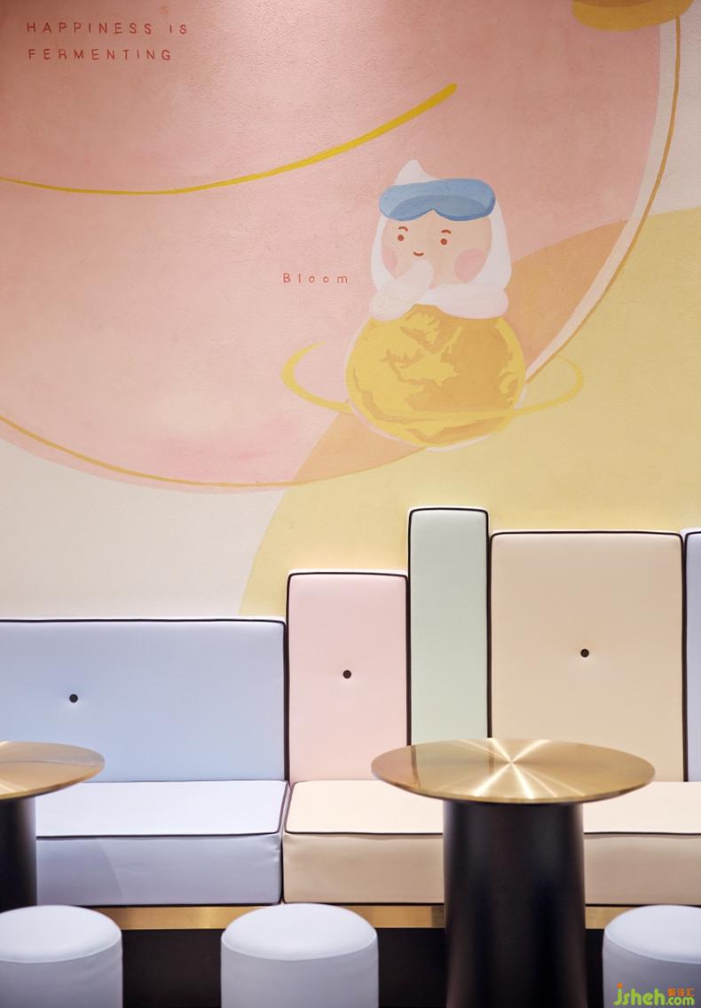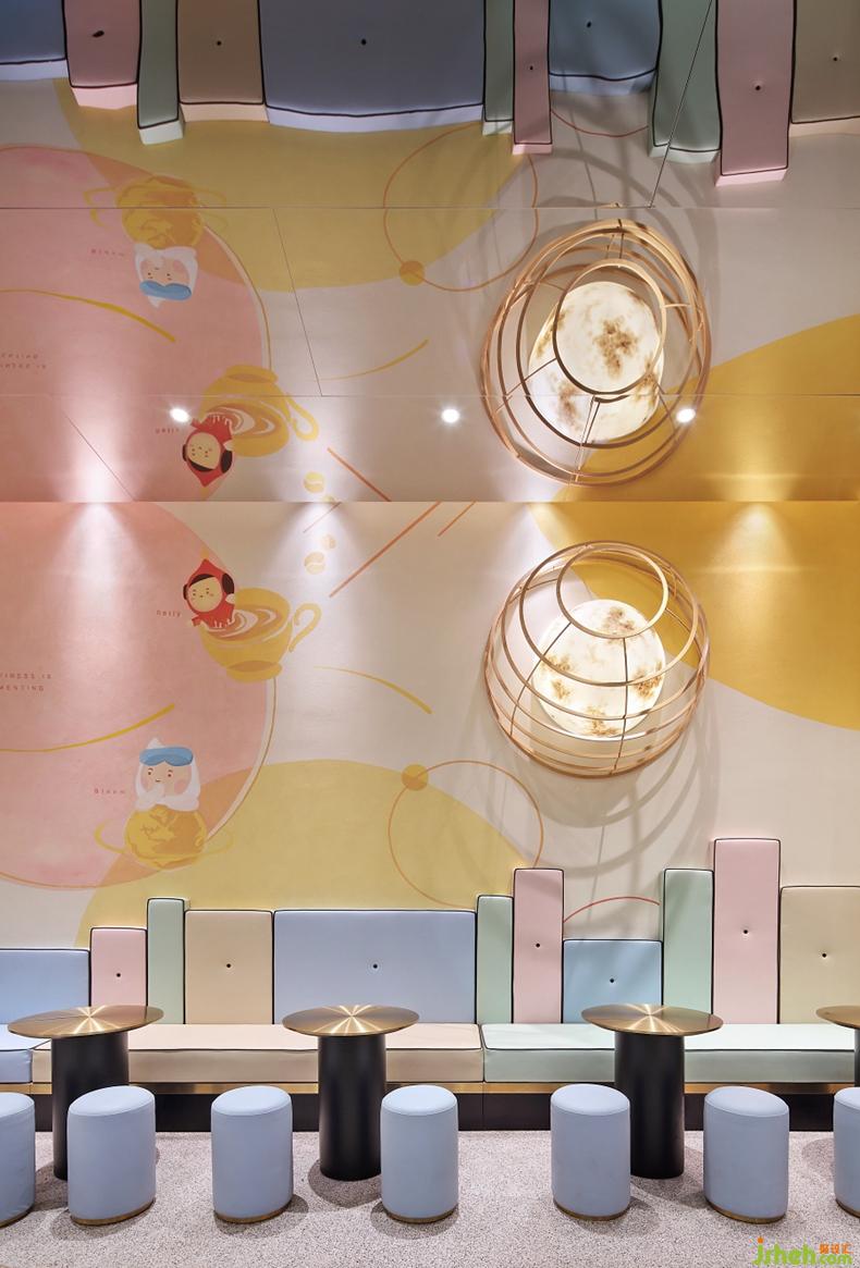 豐富亮眼的彩色座椅和醬寶與星球故事的墻繪,讓原本單一的空間變得溫暖,多了一分煙火氣息,呈現(xiàn)給顧客有趣而溫馨的感覺。設(shè)計(jì)公司