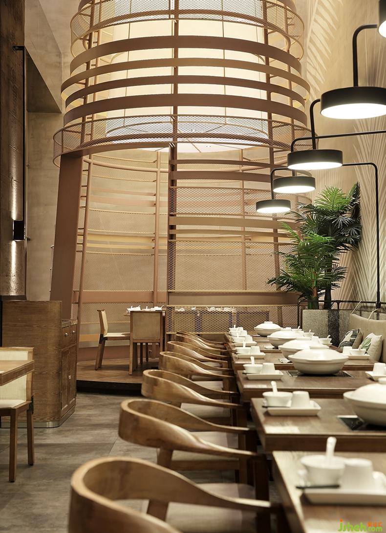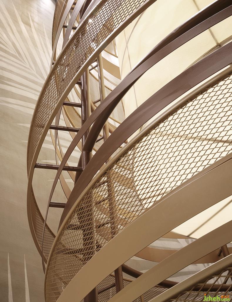 除此之外,設計師提取椰樹元素,利用原有建筑10米層高的特點,用黃銅打造出椰樹形態(tài)的裝置,一圈一層黃銅纏繞,形象生動的刻畫了椰樹桿的自然肌理,在滿足包間功能的基礎上,為空間創(chuàng)造出獨有的藝術裝置,在提升藝術感同時也增添了一種宏偉的視覺感受。餐廳設計