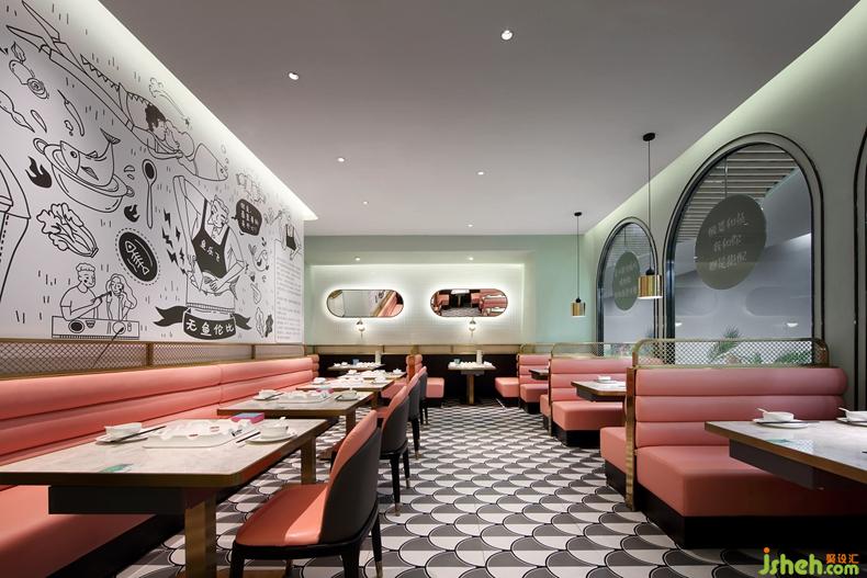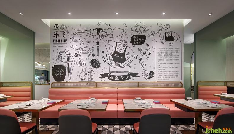 品牌文化為空間注入鮮活的靈魂,“無魚倫比”的主題插畫、“酸菜和魚 我和你 都是絕配”等品牌文案,皆是年輕人青睞的趣味化溝通方式,拉近空間、食物與顧客之間的距離。深圳餐廳設(shè)計