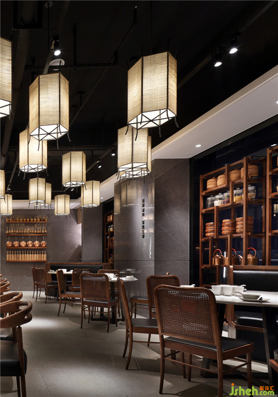 設(shè)計師走訪三峽之地,從古建筑中汲取靈感,將千百年來藏匿于屋檐下的斗拱重新創(chuàng)作,以另一種頂天立地的方式存在于空間,不止是陳列食材餐具,更是盛載著人們對過往的眷戀。餐廳設(shè)計