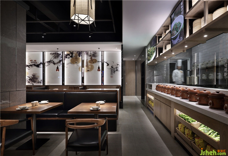 廚房區(qū)開了長型橫向的透明視窗,將食物的呈現(xiàn)過程演繹成動態(tài)的展演現(xiàn)場,透著廚房明亮的燈光和忙碌的身影,一蔬一飯飽藏的氤氳溫情,不著痕跡的融入餐敘氛圍。餐廳設(shè)計