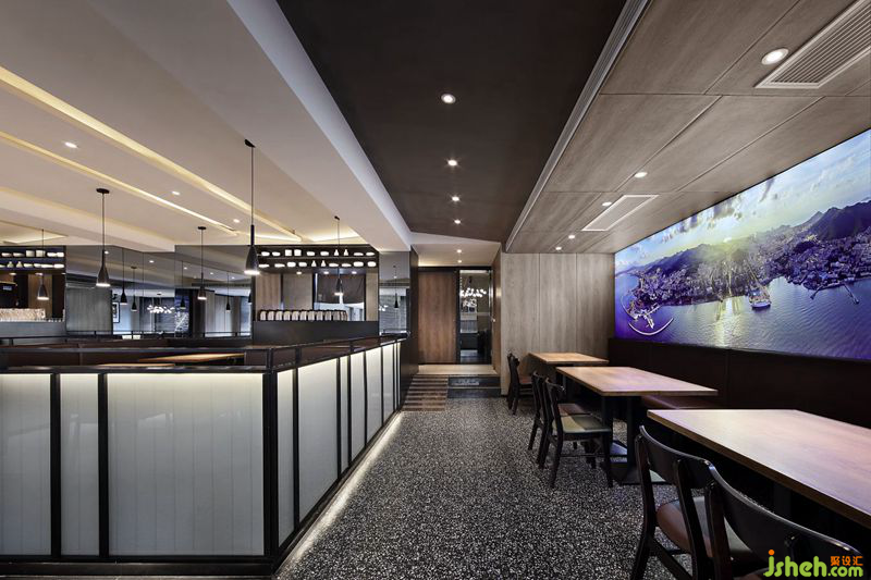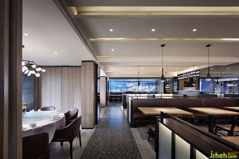 正所謂“千里海岸線,一幅山水畫”。本案空間中裝飾畫皆選用極富威海地域特色的威海景觀,彰顯威海作為海濱城市的獨(dú)特魅力。二層放映著威海當(dāng)?shù)仫L(fēng)景照片的軟膜燈箱,不僅先“聲”奪人,也是自然風(fēng)景和現(xiàn)代時(shí)尚的融合。依靠著木紋墻,欣賞威海自然風(fēng)景,吃春餅,嘗烤鴨,家的溫馨感自然流溢。餐廳設(shè)計(jì)