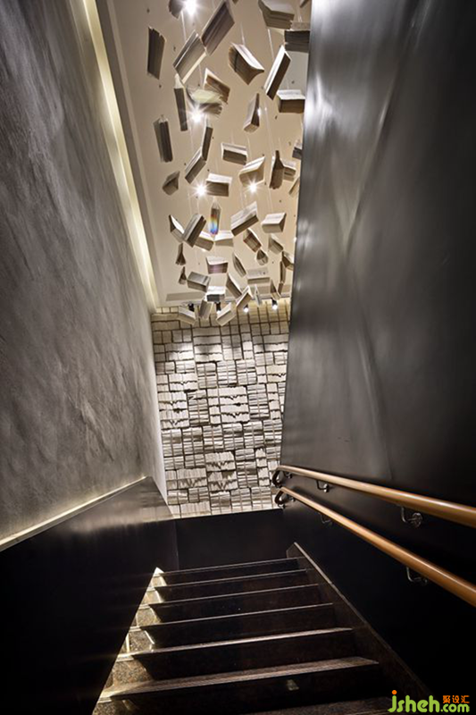 因毗鄰山東大學(xué),設(shè)計(jì)師在空間設(shè)計(jì)中增添了書籍元素,契合周邊大學(xué)的書香氣息。懸掛在樓梯天花上的書籍裝置映入眼簾,一排排陳列的書半開(kāi)半闔,錯(cuò)落有致,營(yíng)造出“書海”氛圍,給人一種猶如沉浸在知識(shí)海洋的夢(mèng)幻感。