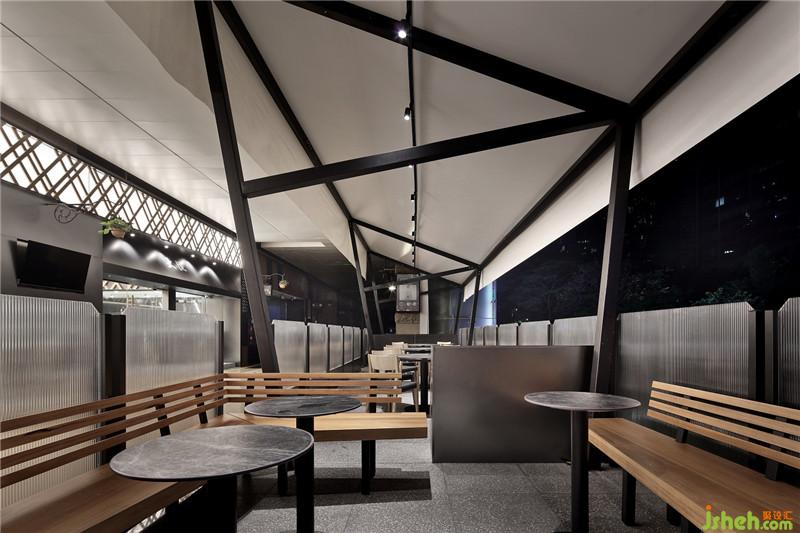 本案空間有兩層及一樓外擺區(qū)。雨棚形式的門頭,開拓著空間,給 人收放自如之感;休閑的外擺區(qū),則是放松休憩的空間,一張一弛,輕松自如 。餐廳設(shè)計