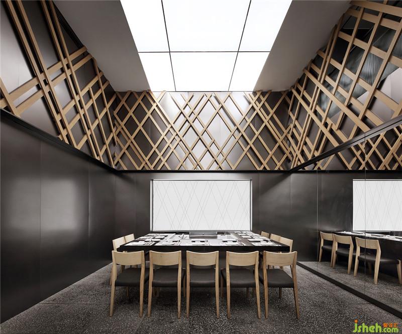 基于此訴求,藝鼎設(shè)計師以大漁的LOGO為靈感來源,通過分解魚頭形狀,進(jìn)行鏡像、組織,以三角形體的形式呈現(xiàn)在空間里,應(yīng)用現(xiàn)代手法打造了一個簡約、日式、略帶商務(wù)風(fēng)的空間。餐廳設(shè)計