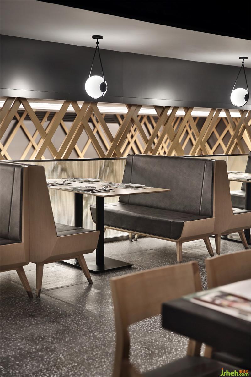 從大漁logo提煉的三角形漁網(wǎng),在環(huán)繞空間區(qū)重復(fù)列陣,井然有序,節(jié)奏明快,再配合質(zhì)感的現(xiàn)代燈膜,讓大廳和包間和顧客之間親密互動。餐廳設(shè)計