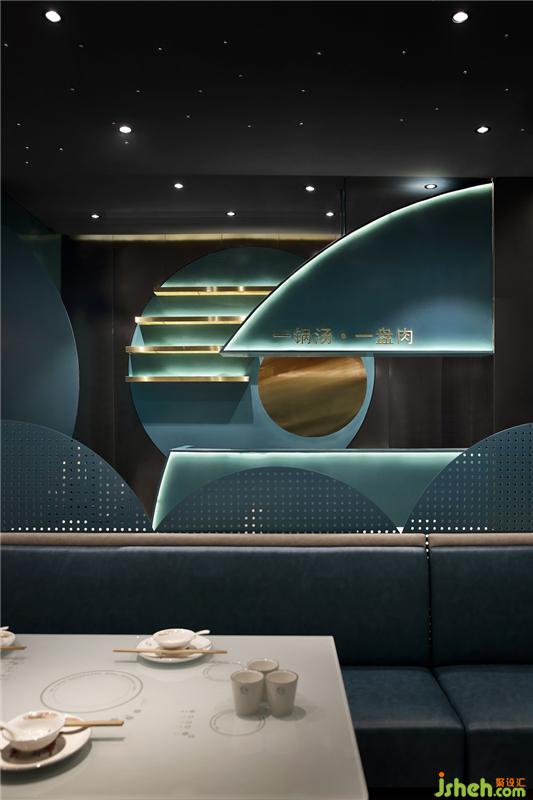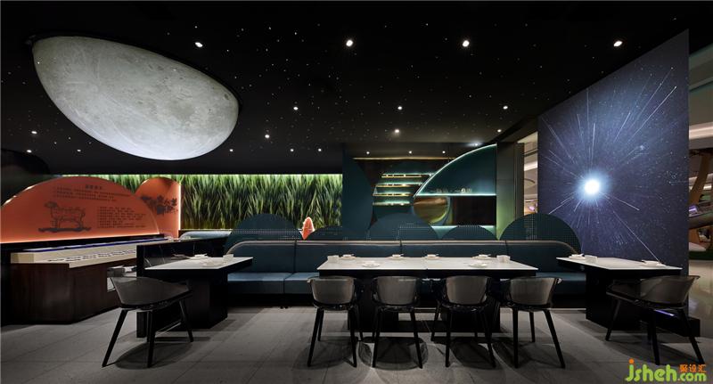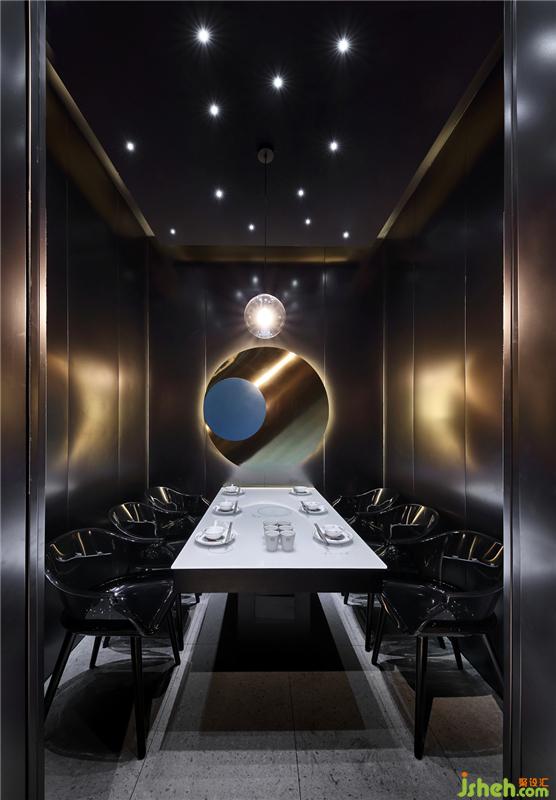 空間中圓的應(yīng)用很搶眼,這轉(zhuǎn)化自月亮的圓形,在多變星光氛圍的烘托下,皎潔的月,恍如夢(mèng)境。同時(shí)大圓也呼應(yīng)了餐桌上的圓形火鍋等器具。餐廳設(shè)計(jì)