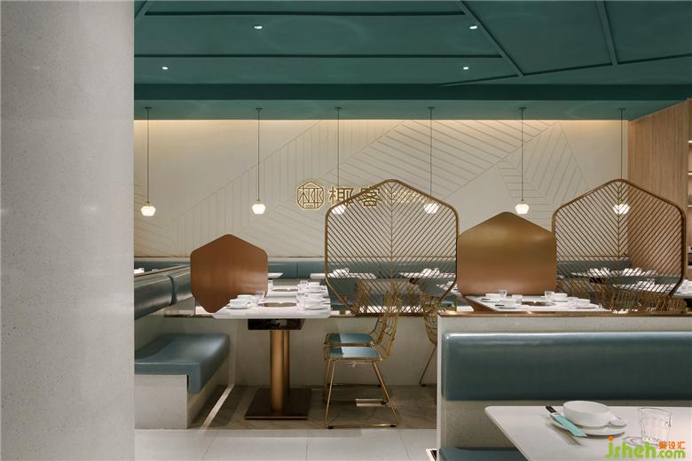 從“椰殼”走進(jìn)椰子里,又見一片蔚藍(lán)的海灘風(fēng)光??臻g里,大到門頭和隔斷,小到屏風(fēng)和燈籠,都是品牌元素潛移默化的滲入和應(yīng)用。餐廳設(shè)計(jì)