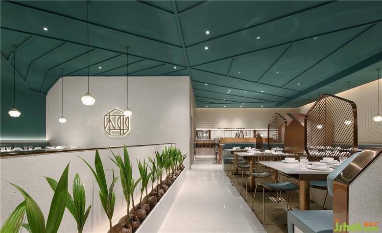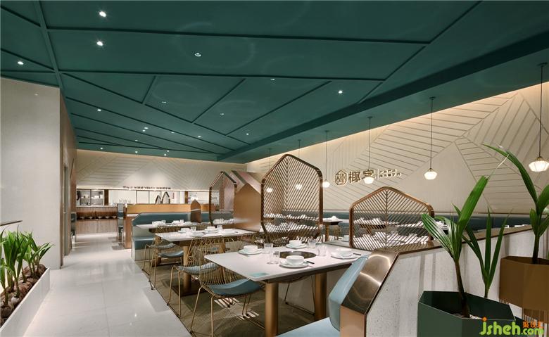 以海灘為基礎(chǔ)色調(diào),以深藍(lán)和淺藍(lán)的海洋為空間輔助色,還提煉出椰樹葉子的線條元素,營造出清新自然、舒適休閑、時(shí)尚輕奢的聚餐氛圍。餐廳設(shè)計(jì)