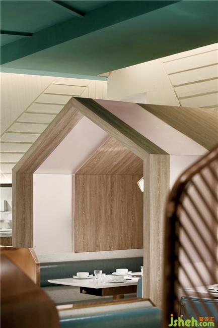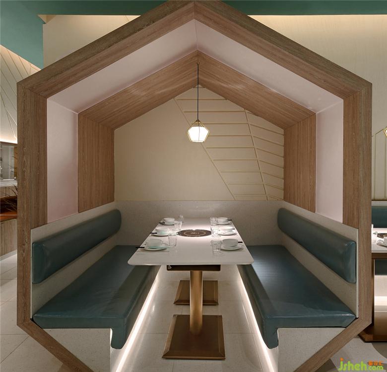 走在水墨石上,有一種沙灘漫步的感覺,這是金沙色水磨石的功勞。除了蔚藍(lán)的天花,深海和淺海還呼應(yīng)著餐廳里深藍(lán)和淺藍(lán)色的桌椅。餐廳設(shè)計(jì)