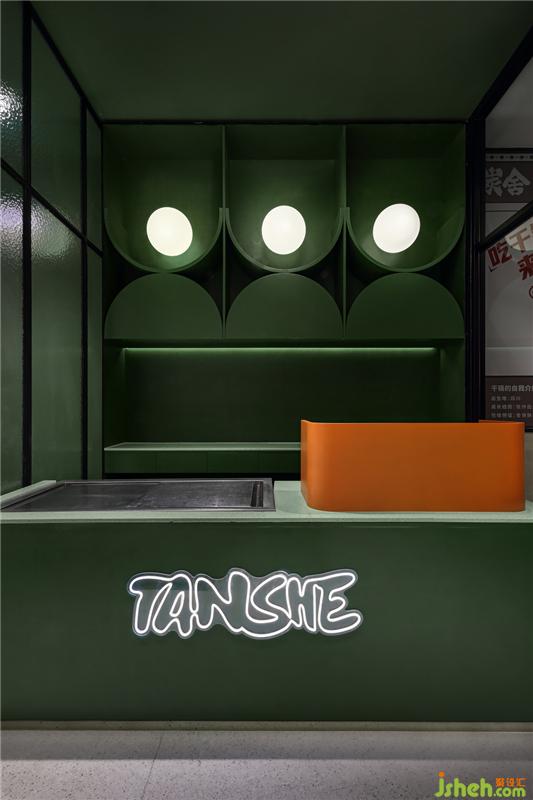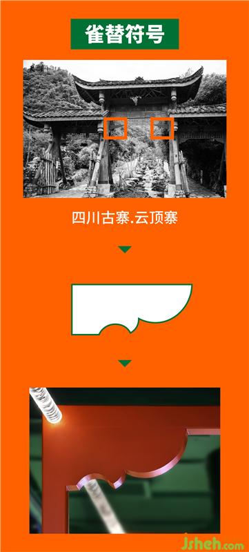 從極具代表性的四川云頂寨中提煉出“拱”+“雀替”符號(hào),將炭舍的品牌橙色+主打藤椒產(chǎn)品的藤椒綠設(shè)為空間主色調(diào)。