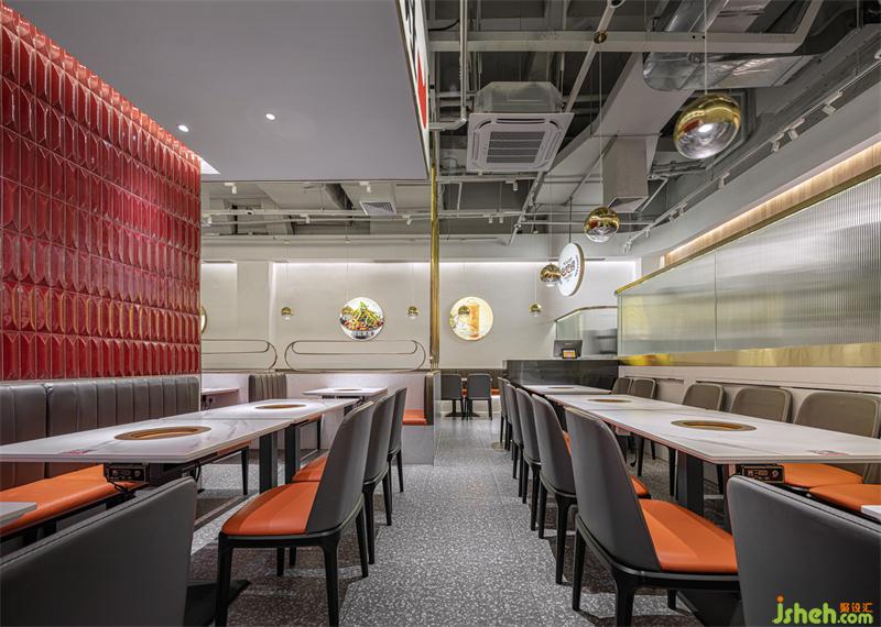 “廣州牛雜煲,就吃牛小灶” 本案「牛小灶」空間設計經過我們分析論證圍繞簡約干凈的基調開展設計師從牛小灶logo中拆解品牌超級符號“紅色大牛角”解構重組、轉化應用在空間中營造簡潔干凈、質樸自然的牛氣空間