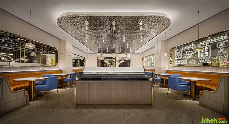 本案港式餐廳設計從新寶餐廳的logo提取元素,以弧形、圓角、矩形的轉化應用,構筑沉浸式的現(xiàn)代港意空間。門頭立體化“S”弧造型有裝置意味,霸道式吸睛,不給人思索余地,卻高度聚焦品牌元素,表現(xiàn)視覺力量。水紋不銹鋼更是形變的弧形之濫觴,在規(guī)則和靈動之間的自由跳躍,躍動的弧形和硬挺矩形碰撞,方中有弧,弧里有方,張弛有度。