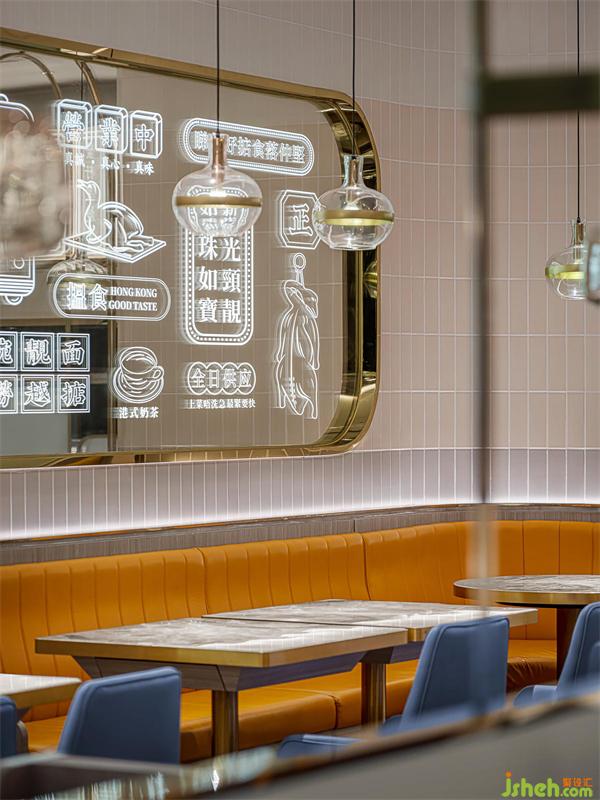 港式餐廳設計室內空間上下呼應,左右聯(lián)動,左邊天花上水紋不銹鋼暗藏燈光,精致感瞬間提升了幾個度。鏡面上,香港特色的招幌辨識度十足,霓虹發(fā)光字悄無聲息地拆解香港文化。三種顏色地瓷片變化,讓視覺感觸連線著味蕾享受,并一次次環(huán)繞升華。