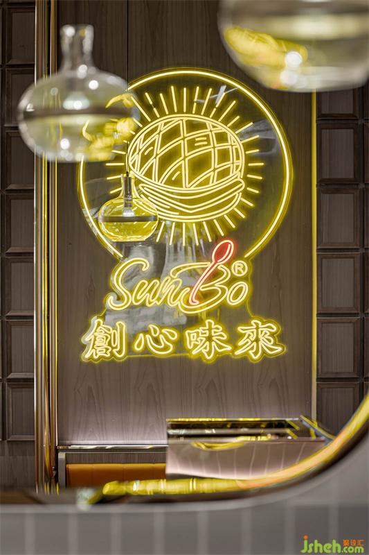 右邊區(qū)域地天花仍舊搶眼,木紋鋁通材料對木板的溫性亦步亦趨,圓形中有方格,方格中帶三角,又以十字結(jié)構(gòu)斜街,寓意中西方文化融合的痕跡。該區(qū)域色彩豐富,可謂絢麗奪目,被點亮的招牌菜綻放如花朵,恨不得渾身染著香氣,吸引顧客。實木飾面拼貼出巧克力墻,奇妙地從視覺上給人甜蜜的感覺.
