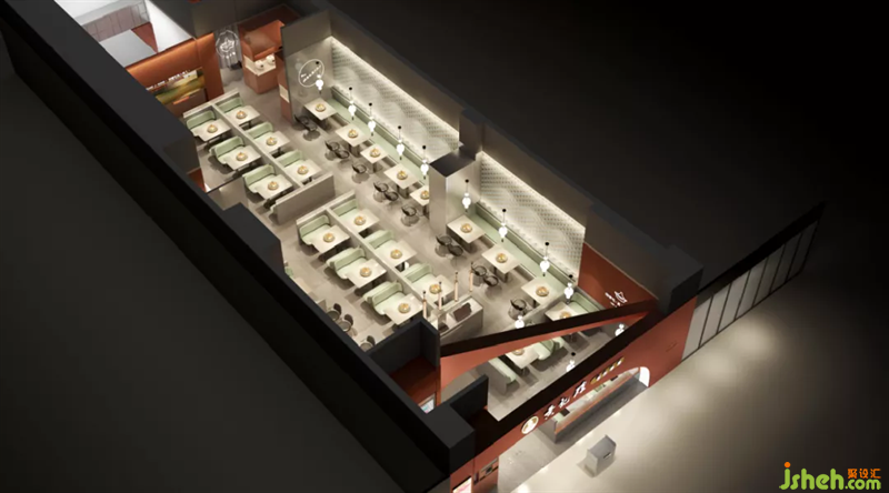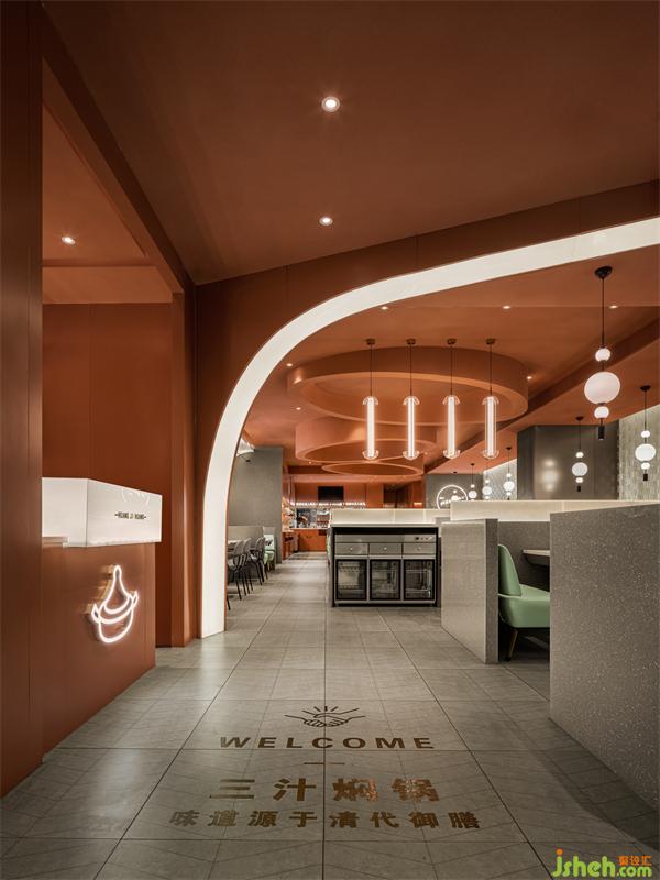 承接歷史的腳步,來到西安古城,瞭望城墻下,拱形門洞里,形形色色的人留往來穿梭,遠(yuǎn)處晚霞散落,夜幕拉下,城門開啟,就是品嘗燜鍋的時(shí)刻。本案黃記煌升級設(shè)計(jì),設(shè)計(jì)師將古城的布局整理演化,結(jié)合城墻的拱形元素,在入口打造一處“城門”打卡造型,兩道拱門交錯(cuò)疊加,彼此呼應(yīng)。顧客走過2道拱門,才到城內(nèi),正式進(jìn)入黃記煌這味蕾之城。