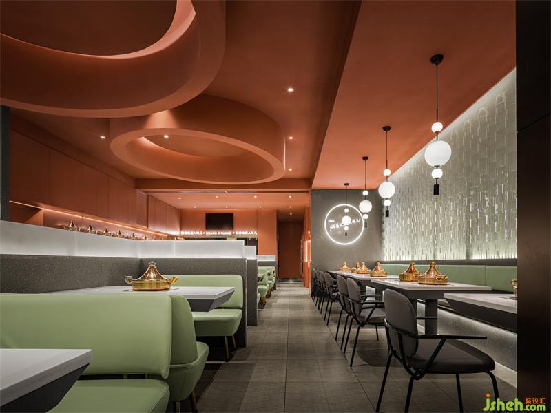 茶色天井營造出宮殿用餐氛圍,墻面造型是傳統(tǒng)屋檐的抽象賦形,呼應(yīng)著門頭的拱弧元素空間主色取自中國古建筑。大面積的茶色搭配練色,餐廳設(shè)計(jì)以銅綠為點(diǎn)綴,視覺上十分簡約。