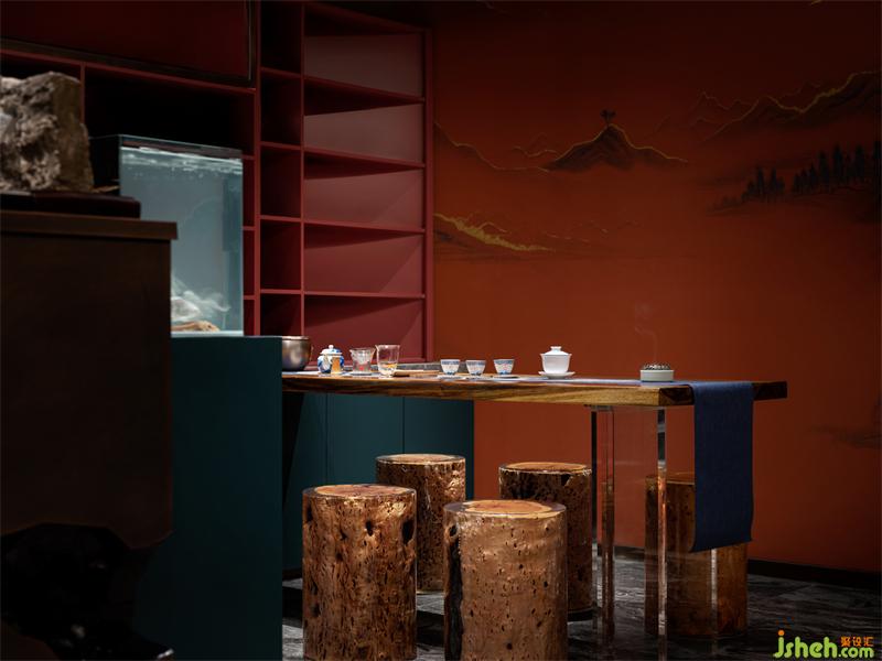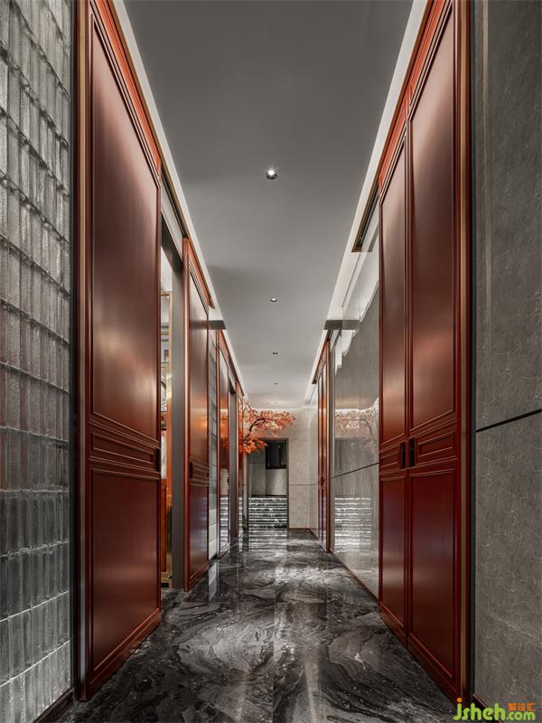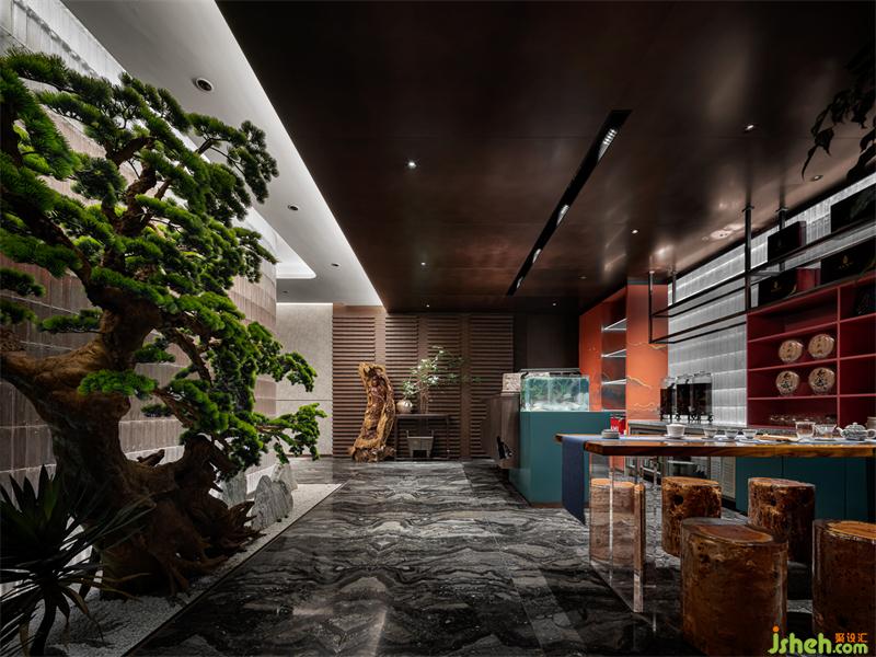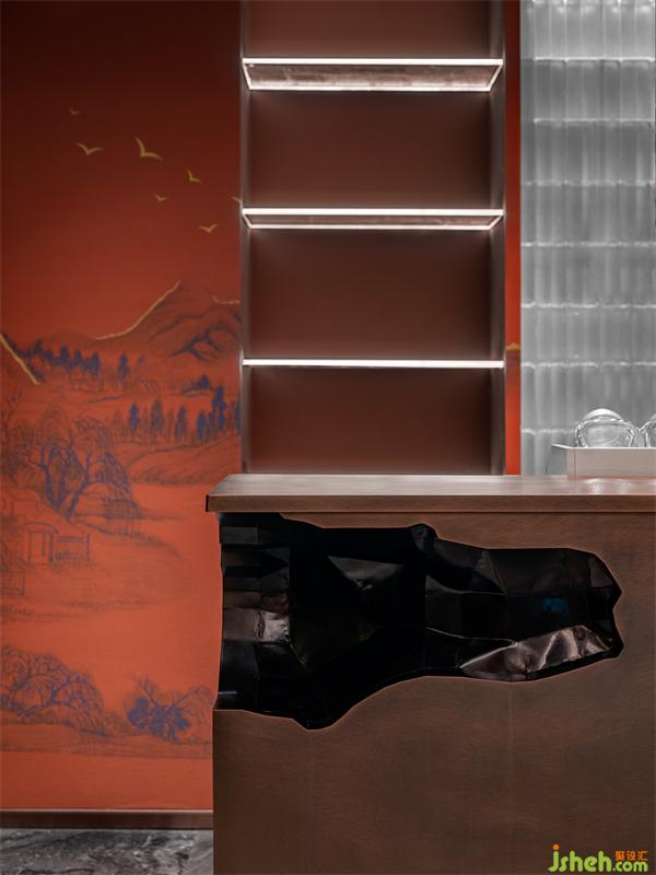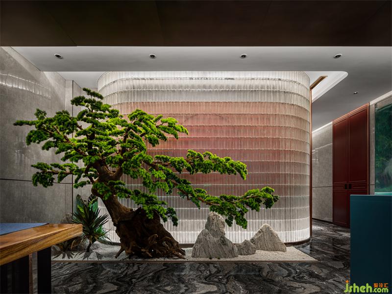 假山和沙石配制出枯山水意蘊(yùn),朦朧的玻璃磚墻為背景映襯綠植之靈,山與水,紅與綠,枯與瘦,明與暗,會所設(shè)計師擷取人們熟稔的青綠山水畫的一角融入會所,賦予空間情與景相融、出入畫中的氣韻。