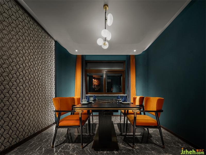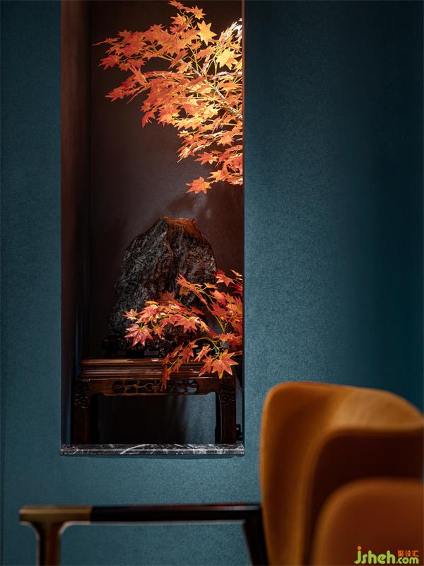 小包間的私密性更高,有別于大包間的鮮明的顏色碰撞,是小巧精致、樸素而多留白的一處所在。木紋地板讓自然舒適的環(huán)境多了一絲溫馨感,大白墻配比木色,簡素而淡雅,若此小室,正宜邀友聚會,圍爐而坐,淺飲暢談。一素一濃,小包間風(fēng)格上也有跳脫。另一處融入濃縮版的北京楓林之景,紅艷如二月花的楓葉裝飾窗框,與深色假山配比出“疏影橫斜”的意境。