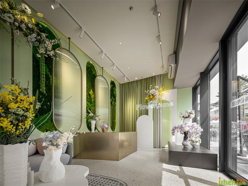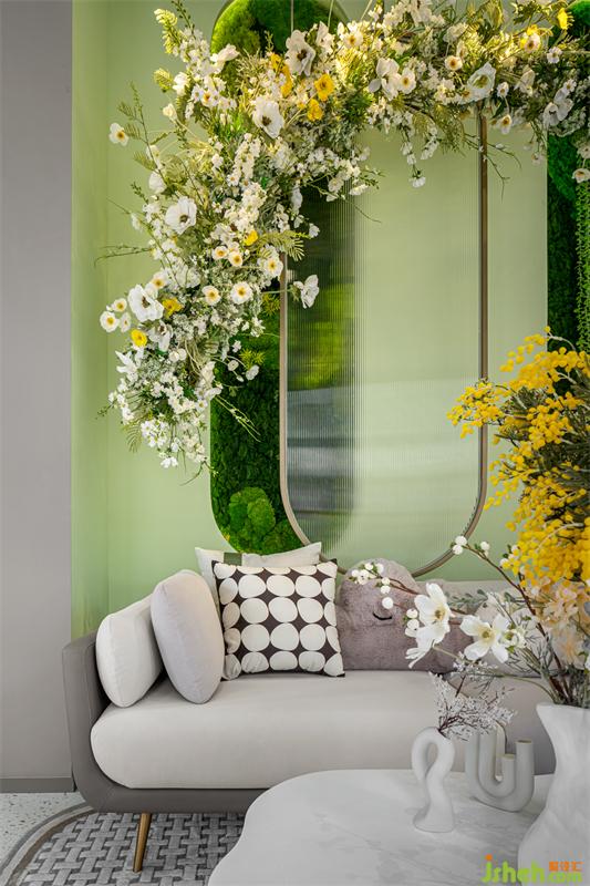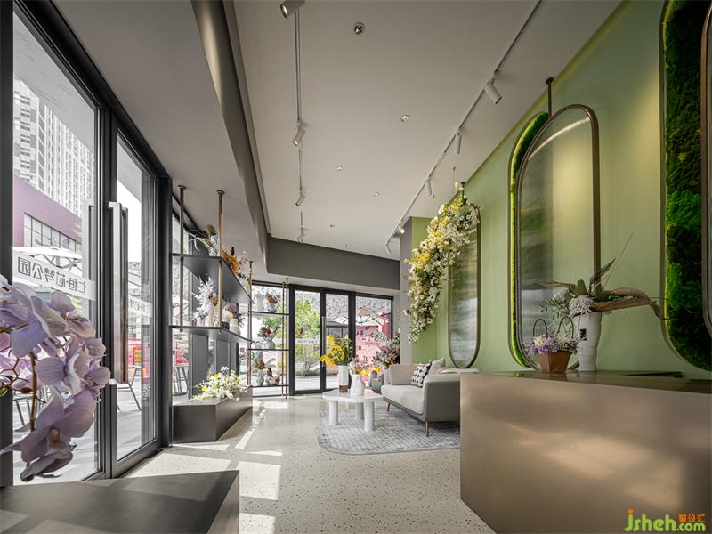素雅的室內(nèi)佈局為花卉搭建出展示舞臺,壁上框景展示草木之美,鏡面造景反射花容之姿,亞克力借景半遮半掩,洩露花卉若有似無的秘密。