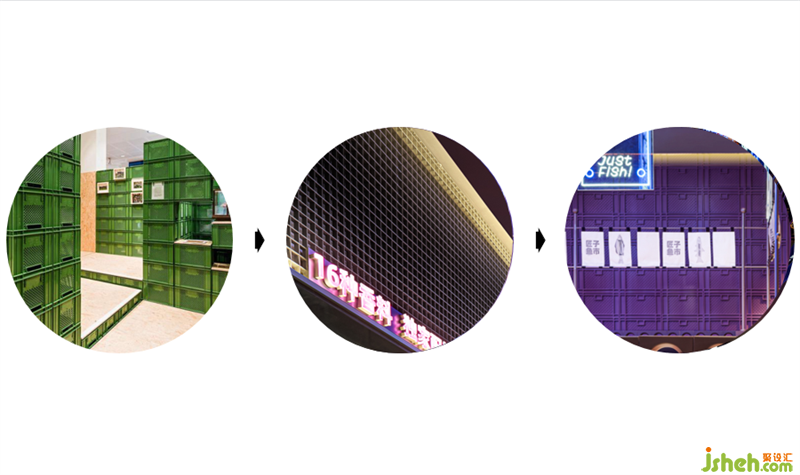 魚市中的吊旗和裝貨箱元素被轉(zhuǎn)嫁到室內(nèi)空間。吊旗以霓虹燈的形式出現(xiàn)在空間的中庭,集裝箱符號(hào)陣列出墻體,集市的氛圍瞬間拉滿。