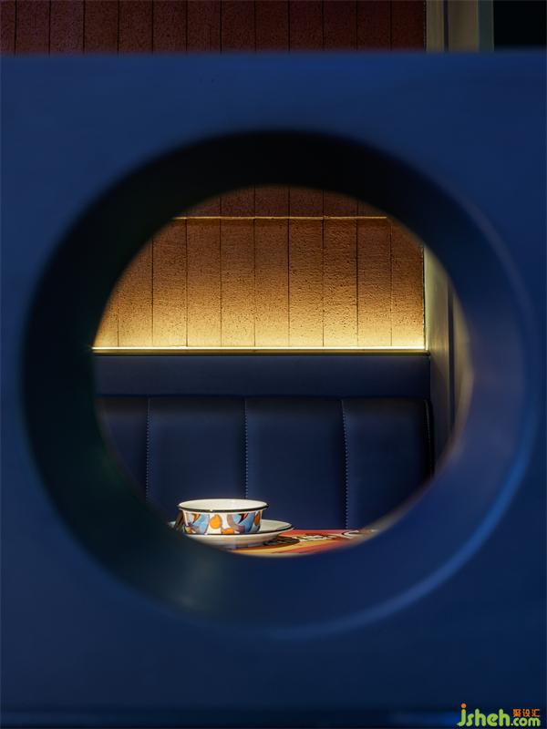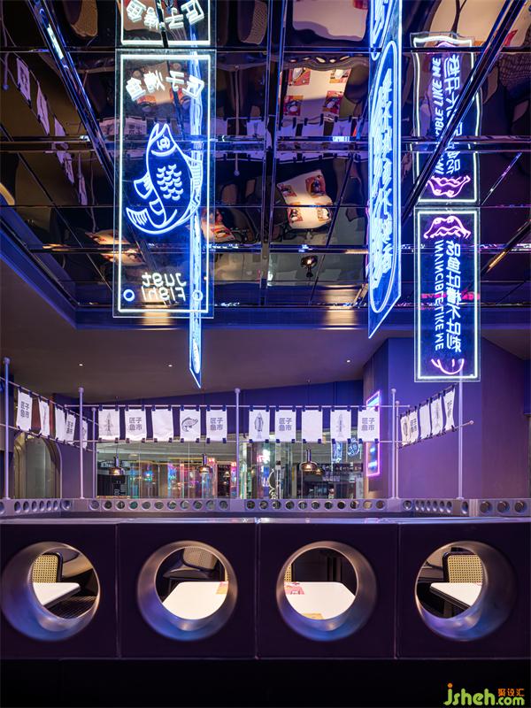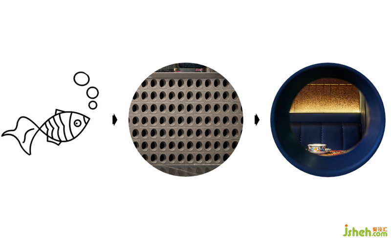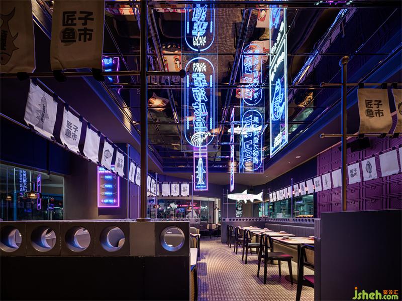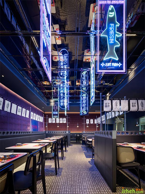 地面有馬賽克方磚模擬石材的質(zhì)地,進(jìn)而模仿魚(yú)市的常用材質(zhì),營(yíng)造質(zhì)樸自然、輕松愉悅的餐飲氛圍;