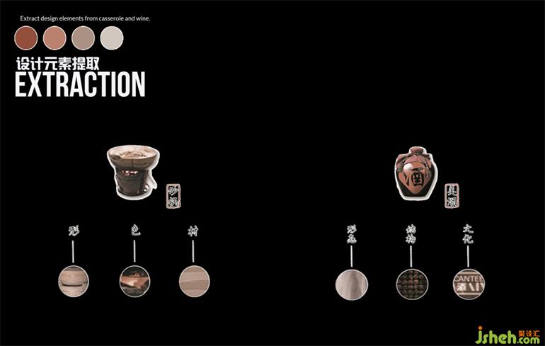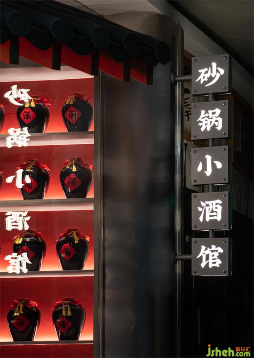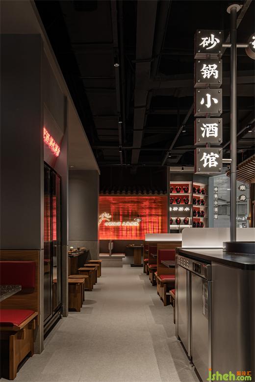 餐廳空間內(nèi)的設(shè)計語言也從“炭火爐+酒器”中提?。荷板佁炕馉t中,星火暗涌,點(diǎn)點(diǎn)赤紅;砂鍋里,熱氣縷縷,彌漫四方;酒器上,取形為用,序列組合。濃烈的江湖氣與砂鍋美食文化碰撞融合。