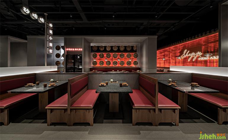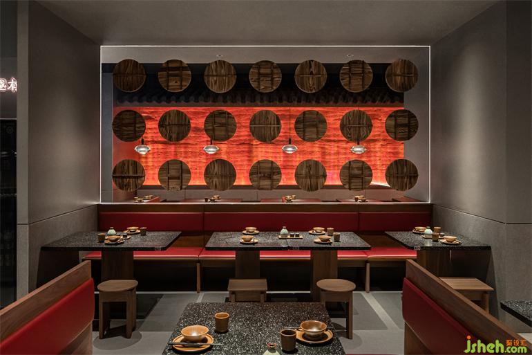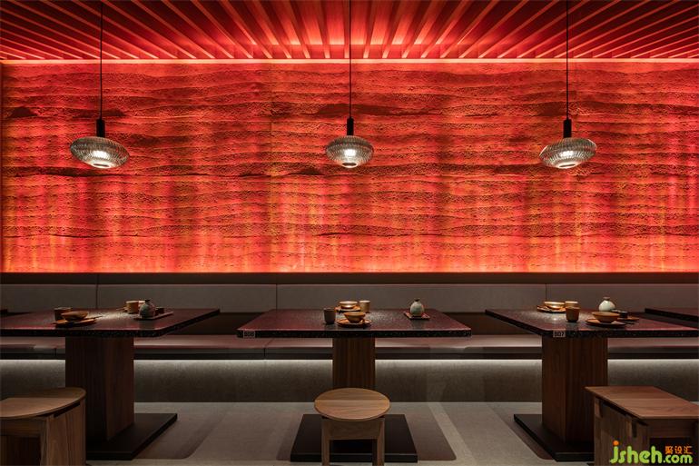 火生土,火與夯土也從火爐而來,暗涌之火,熱烈而激情,升騰于夯土之上,小酒館設(shè)計(jì)由動(dòng)態(tài)火紋燈模擬,豐富表現(xiàn)形式的同時(shí)詮釋出動(dòng)靜結(jié)合、自成一體的空間印記。