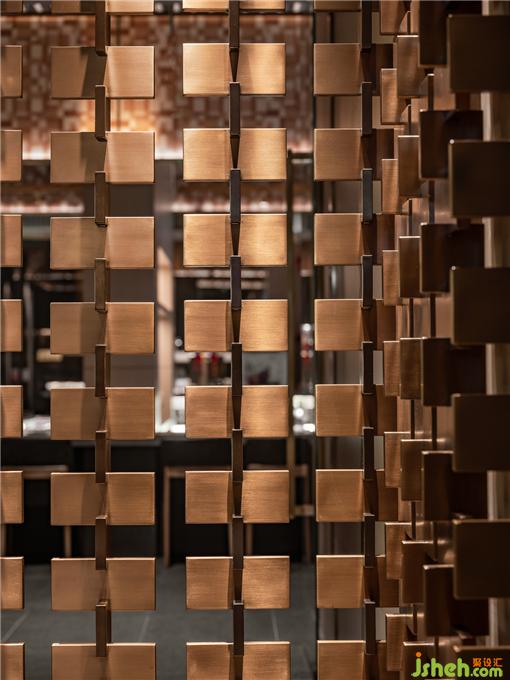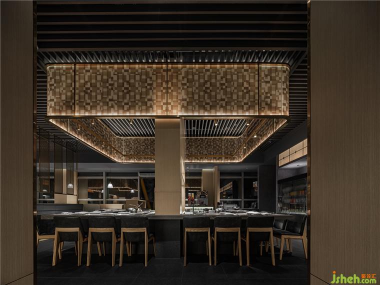 主鐵板操作臺,作為空間視覺核心,由淺木色做底,淺灰、深灰外立面上下聚合,搭配暖調(diào)燈光組成,完成了核心色彩與內(nèi)容填充。古銅金元素的介入將空間的色調(diào)與材質(zhì)稍稍“破局”,也與大漁的風(fēng)格調(diào)性遙相呼應(yīng)。