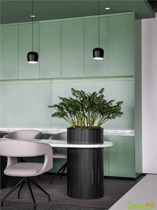 白色大理石臺(tái)面、深灰色瓷磚貼片從不同維度塑造著北歐式簡(jiǎn)約,辦公室裝修設(shè)計(jì)休閑就餐或短暫小憩,肆意輕快,隨性溫馨。